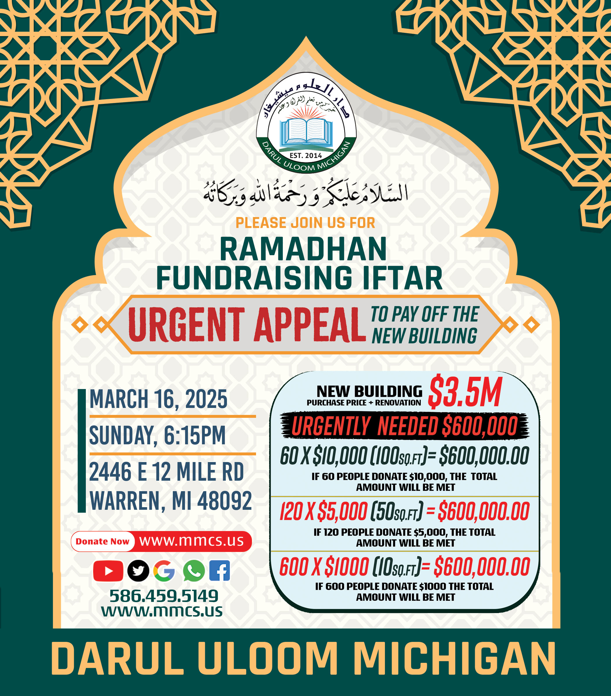 We hope that Allah Ta'ala has kept you all in a good state of Imaan and health. Alhamdulillah, our Madrasah currently offers Full‑time Alim, Hifz, and Nazirah classes, along with virtual academic classes. However, our current building can no longer accommodate all full‑time activities. To meet the growing needs of our students, we are beginning Phase 1 renovation of our newly purchased building: - Total building space: 35,000 sq. ft. - Phase 1 area: 6,624 sq. ft. To make this space ready for use, we urgently need $600,000 (purchase + renovation). We humbly request your continuous support and du‘a. May Allah Ta'ala accept our efforts and reward you and your families with His mercy and blessings. Aameen